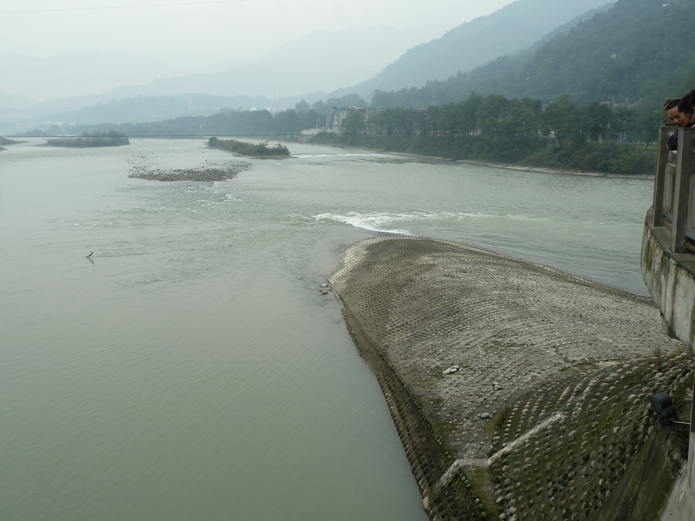 Anfangs überlegte man wohl, einen großen Staudamm zu bauen. Der hätte die damaligen Möglichkeiten aber wohl doch überfordert, nicht zuletzt wegen der gewaltigen Schlammfracht des Flusses. Zudem war Li Bing gehalten, die freie Schiffbarkeit auf dem Min sicher zu stellen: Aus militärischen Gründen durfte kein Staudamm die Schiffe aufhalten. So entwarf er einen genialen Plan, den wir heute noch bewundern. Er schuf, unterstützt von seinem Sohn, die gigantische Bewässerungsanlage, die den Min zähmte, die Ebene von Sichuan bewässerte, Überschwemmungen verhinderte und gleichzeitig die Schiffbarkeit des Flusses verbesserte. Sie ist noch heute in Betrieb.